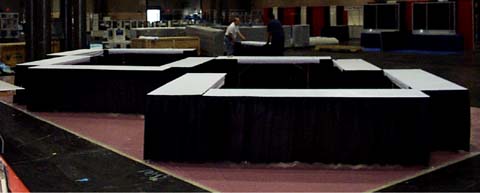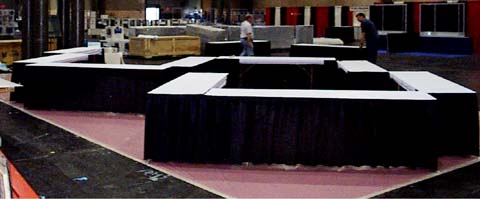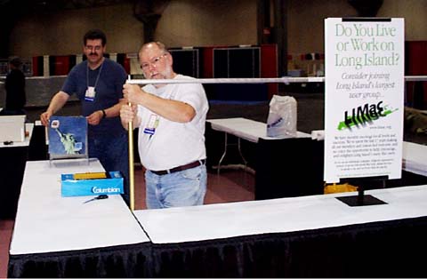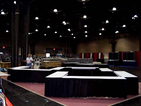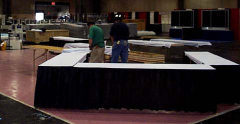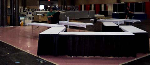 Rick eyes the alignment of the 8th desk. We will have to make some slight adjustments since the carpet is not precisely 20 by 40 foot. The Javit's 3rd floor where the Expo is held is pretty big and this view only shows maybe a quarter of it. (The far right rear corner) The Internet Cafe will be against the right wall in this view.