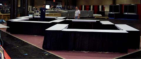 Following along the edge we mark off the edge which will line up with a corner of one of the 2 by 8 foot draped desks. Here Bradley does some work with the master plans in hand. You can see in the background other booths under construction.