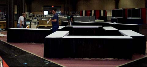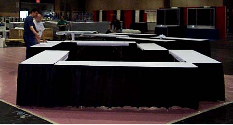 The "sub-booth" #4, where LIMac will be found is now complete. It seems the Freeman Decorating crew is racing each other to finish the other desks. They have delayed their lunch for us, so we appreciate the extra effort.