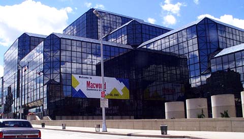 Can you see the grey box on the desk in front of the standing man? That box should look a lot like a Power Mac G4 Cube. That's where people will be putting in their business cards for a chance to win a great raffle prize.