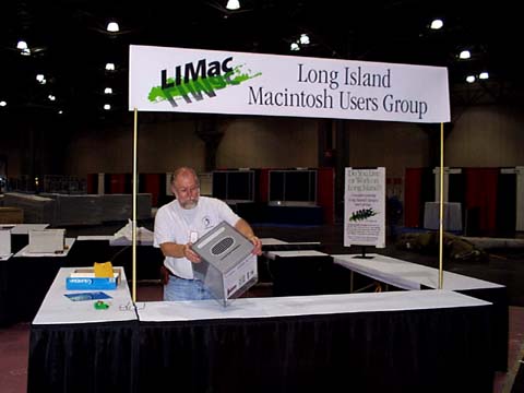 Now that we have desks to work on, Bradley starts finishing the raffle boxes by applying the artwork. The raffle box in the LIMac section will look like a big Power Mac G4 Cube.. Rick and Bill got to work on the stands and rod for the LIMac banner. The tabletop sign was easy to set up and looks great.