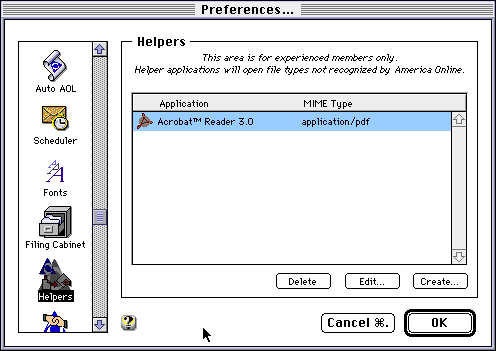 America Online 3.0: AOL 3.0 comes with no helpers defined. Go to the Members menu and select Preferences... and then scroll down and click on the Helpers category. Then click on the Create... button and fill in the dialog box as shown below. Click the Select... button to select the Adobe Acrobat Reader application somewhere on your hard drive and then use the pop up menu to select the file type PDF.