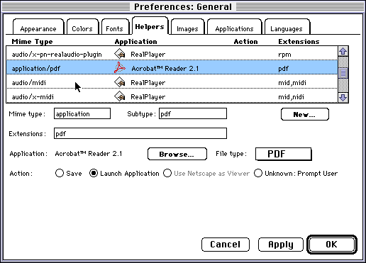 Netscape 2: First check to see if you already have an entry for a Mime Type of application/pdf. If you do, correct it as shown below. If not click New... and enter the details. You need a Mime Type of application, a Subtype of pdf, and an extension of pdf. Browse for the Acrobat Reader application and select PDF as the File type. For Action, select either Save for offline reading or Launch Application for immediate reading. The example shows Netscape Navigator 2 linking to Acrobat Reader 2.1. The plug-in that comes with Acrobat Reader 3 only works with Netscape Navigator 3. I would suggest version 2 for both for people with tight RAM situations.