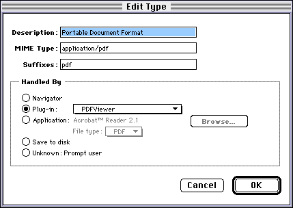 Netscape 3: First check to see if you already have an entry for a Mime Type of application/pdf. If you do, correct it as shown below. If not click New... and enter the details. Description: Portable Document Format, MIME Type: application/pdf, Suffixes: pdf. Handled by Plug-in PDFViewer or Save to disk if you want on-line or offline viewing. The example shows Netscape Navigator 3 handing off the downloaded .pdf file to the Acrobat plug-in so the document shows up in a Navigator window.